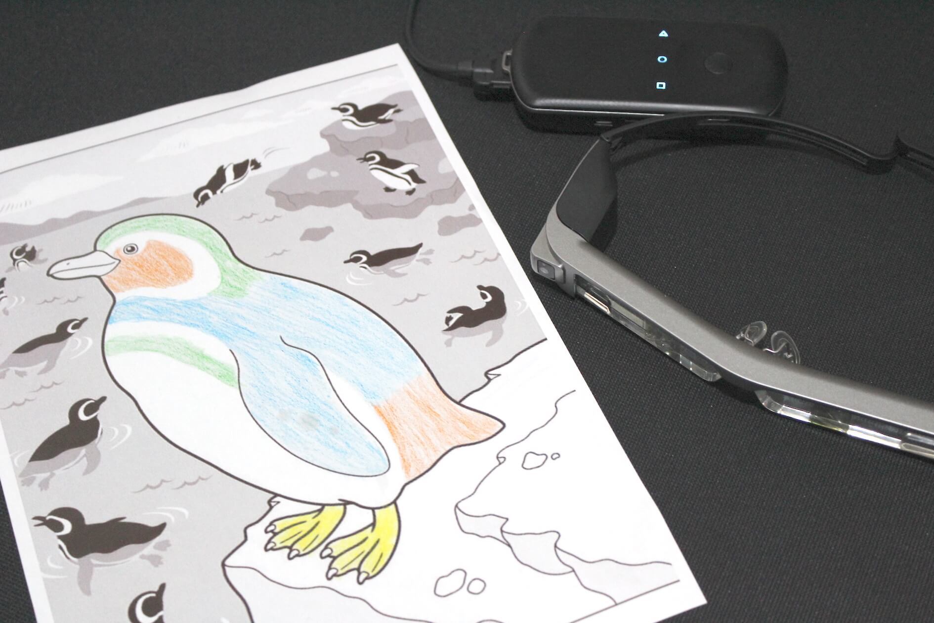 スマートグラス「BT-300」のカメラをぬりえにかざすと、「3、2、1」のカウントダウンが開始。この時、ぬりえと「BT-300」の距離が近すぎると、もう少しカメラを遠ざけてくださいとの警告が表示されます。